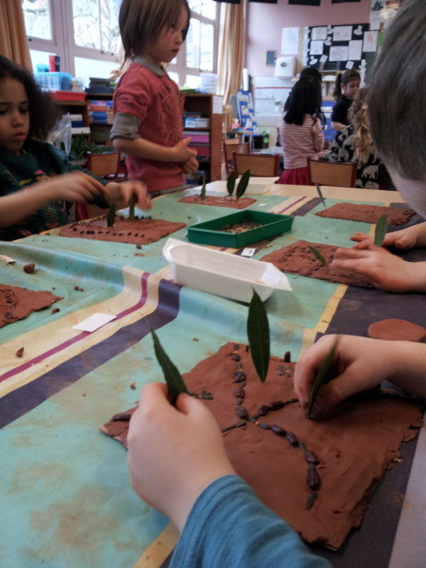 Nous avons créé le support avec de l’argile; C’était lisse, froid, mou, nous avons touché, senti la matière. C’était agréable! Ensuite nous avons modelé l’argile pour faire le terrain de notre jardin, bien lisse. Puis nous avons tracé un chemin avec notre doigt et nous avons ensuite posé des graines dessus. Puis avec des bouts de bois nous avons fabriqué une cabane et nous avons planté des arbres avec des feuilles de buis. Voici nos réalisations!